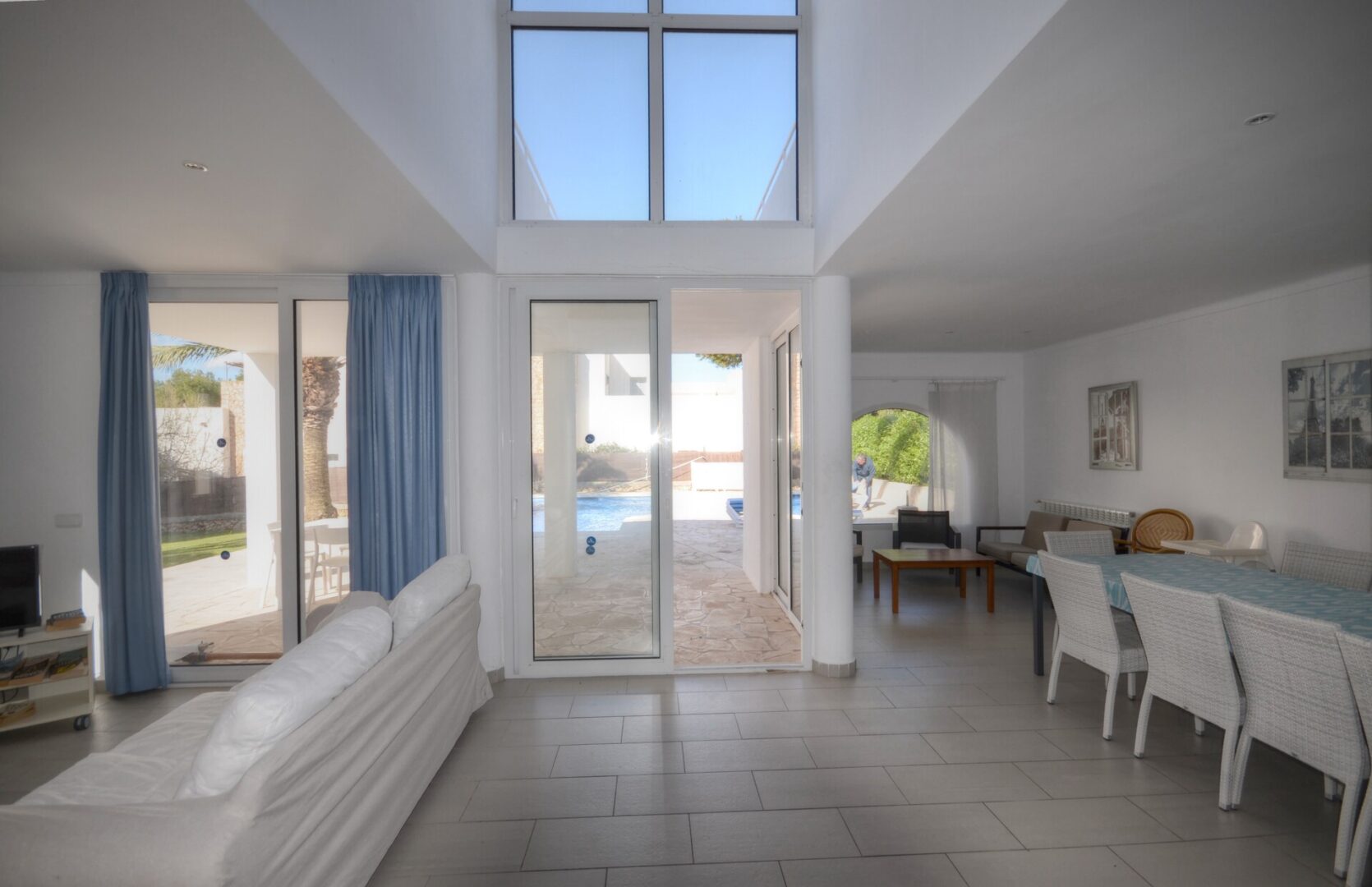 Im Erdgeschoss befindet sich ein weiteres Schlafzimmer und ein Gästebad. Auch der große Wohn-Essbereich ist hier gelegen. Ideal belichtet wird dieser Raum durch viele große, zum Teil bodentiefe Fenster, die auch den Zugang zu den Terrassen oder dem Pool ermöglichen. Die Küche ist separiert, verfügt aber über eine praktische Durchreiche und Zugang zu einer der Terrassen.