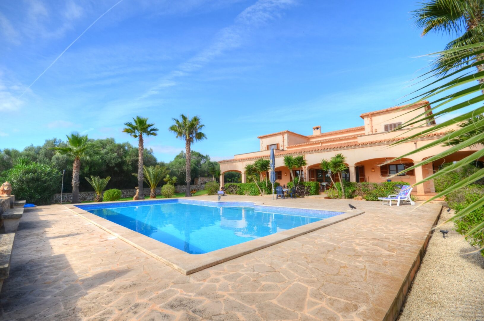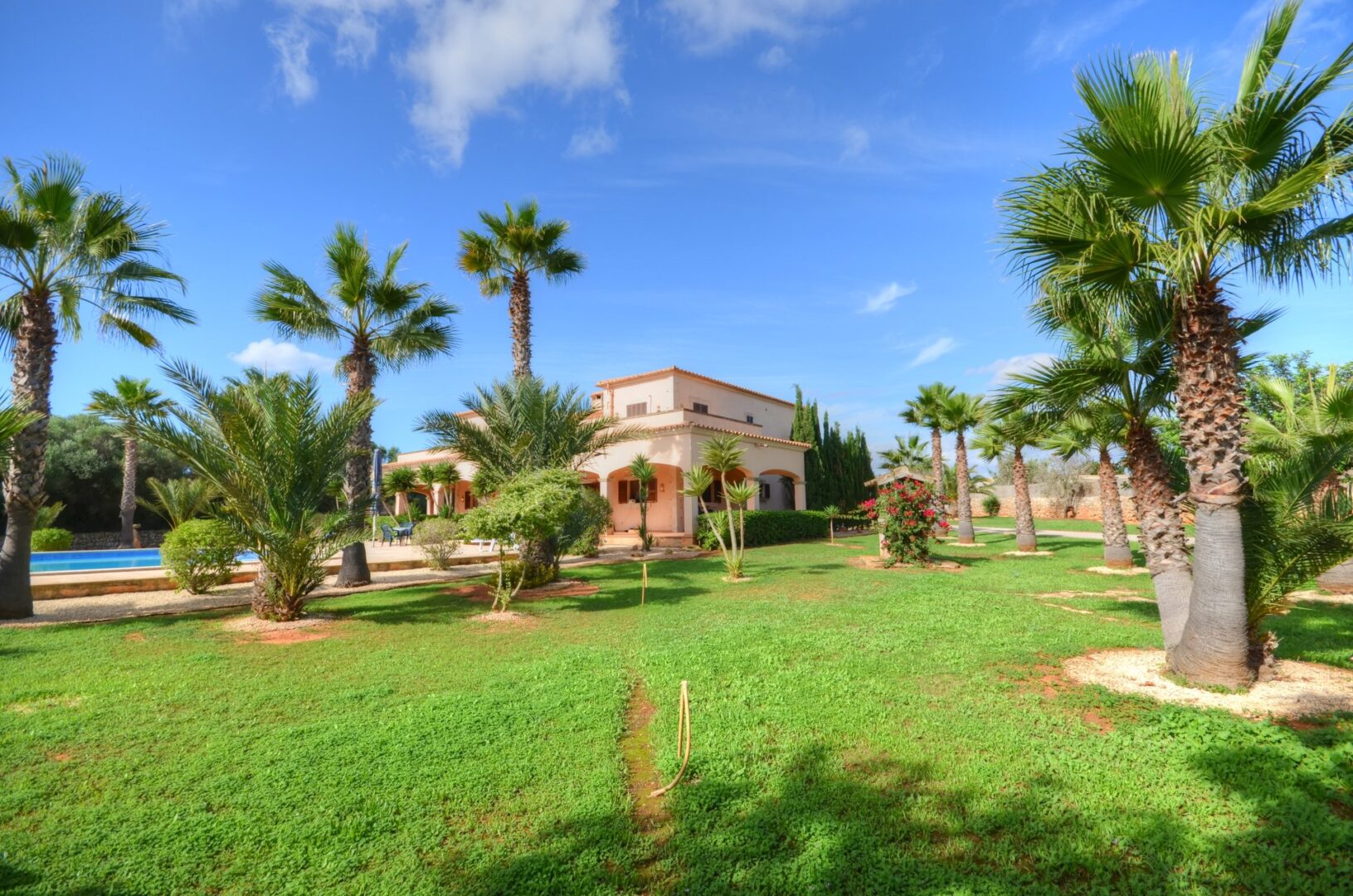 Das Grundstück ist flach und misst etwa 15 000 m². Es ist mit Steinmauern eingezäunt und mit Palmen und mediterranen Pflanzen bepflanzt. Er bietet viele schöne Ecken, um die Natur zu genießen.