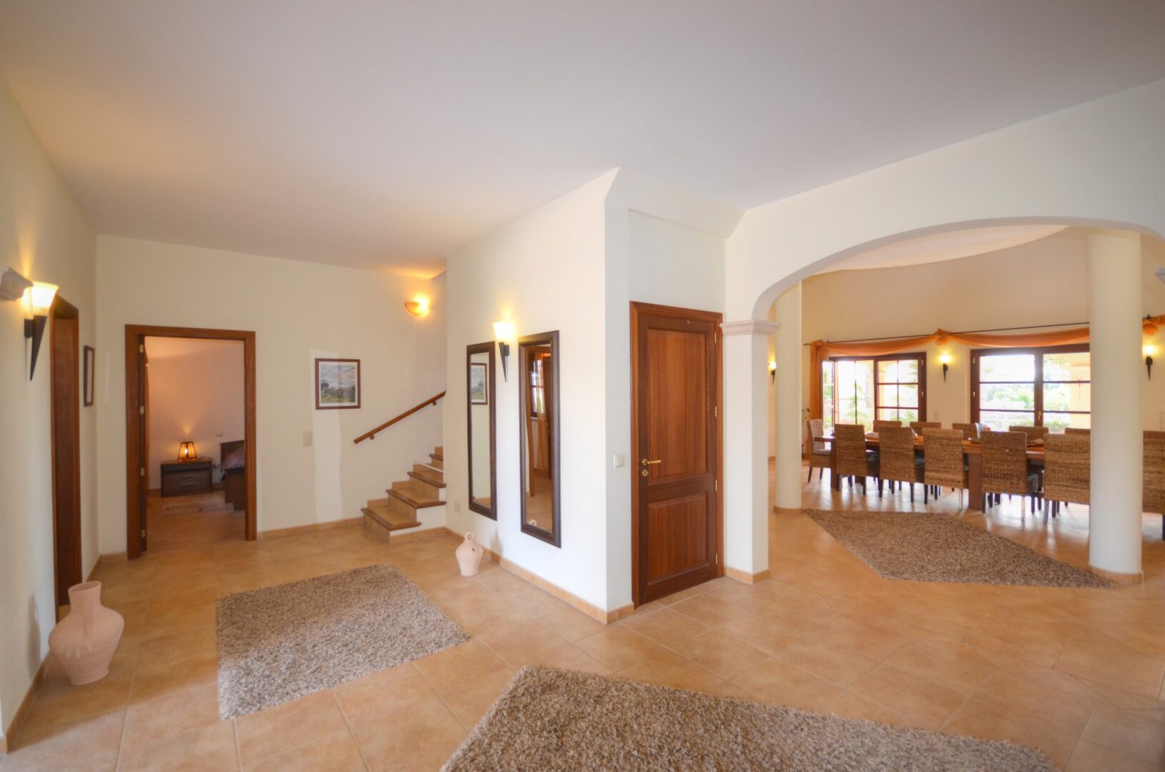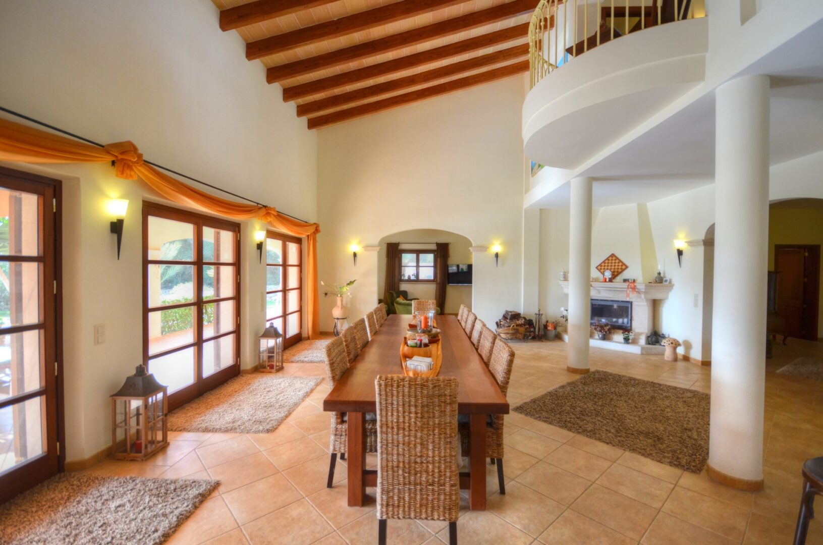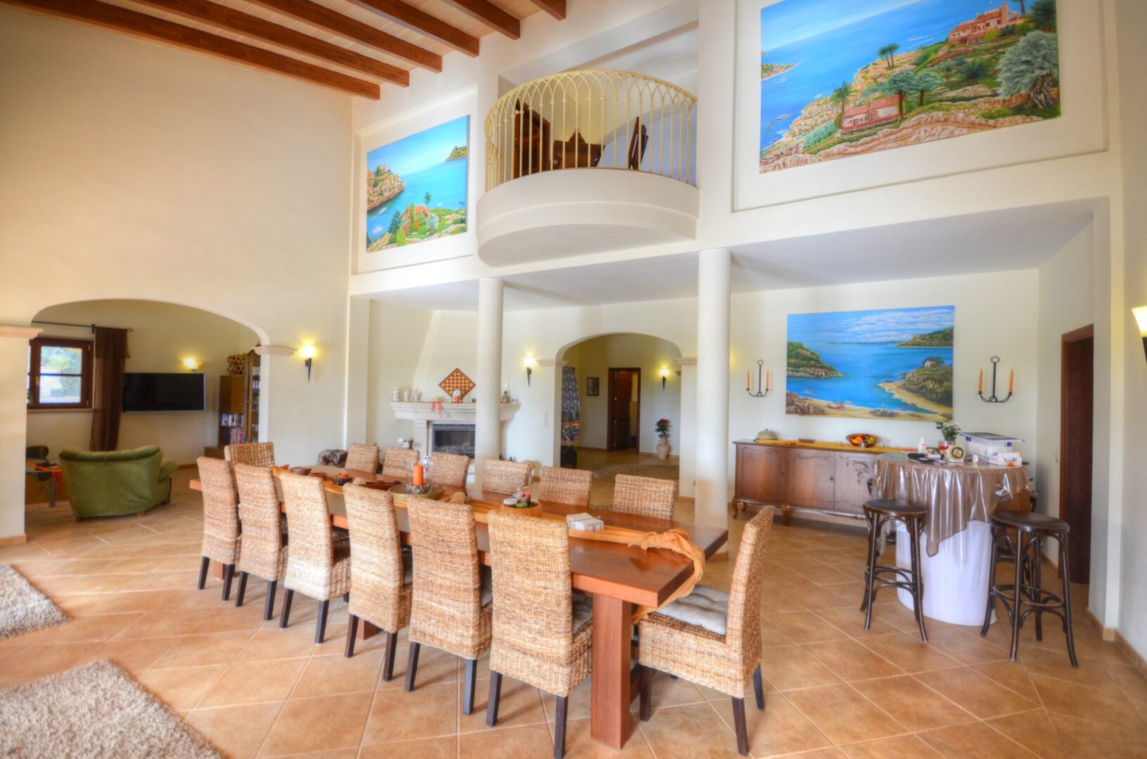 Das Erdgeschoss des Hauses besteht aus einer großen Eingangshalle, von wo man den Zugang zu zwei Schlafzimmern, zwei Bädern, eines davon en suite und einer Waschküche hat. Weiterhin gibt es ein beeindruckendes Esszimmer mit doppelter Höhe und einem Kamin aus Santanyi Stein. Anschließend gibt es dort eine große Küche mit Vorratsraum und ein gemütliches Wohnzimmer.